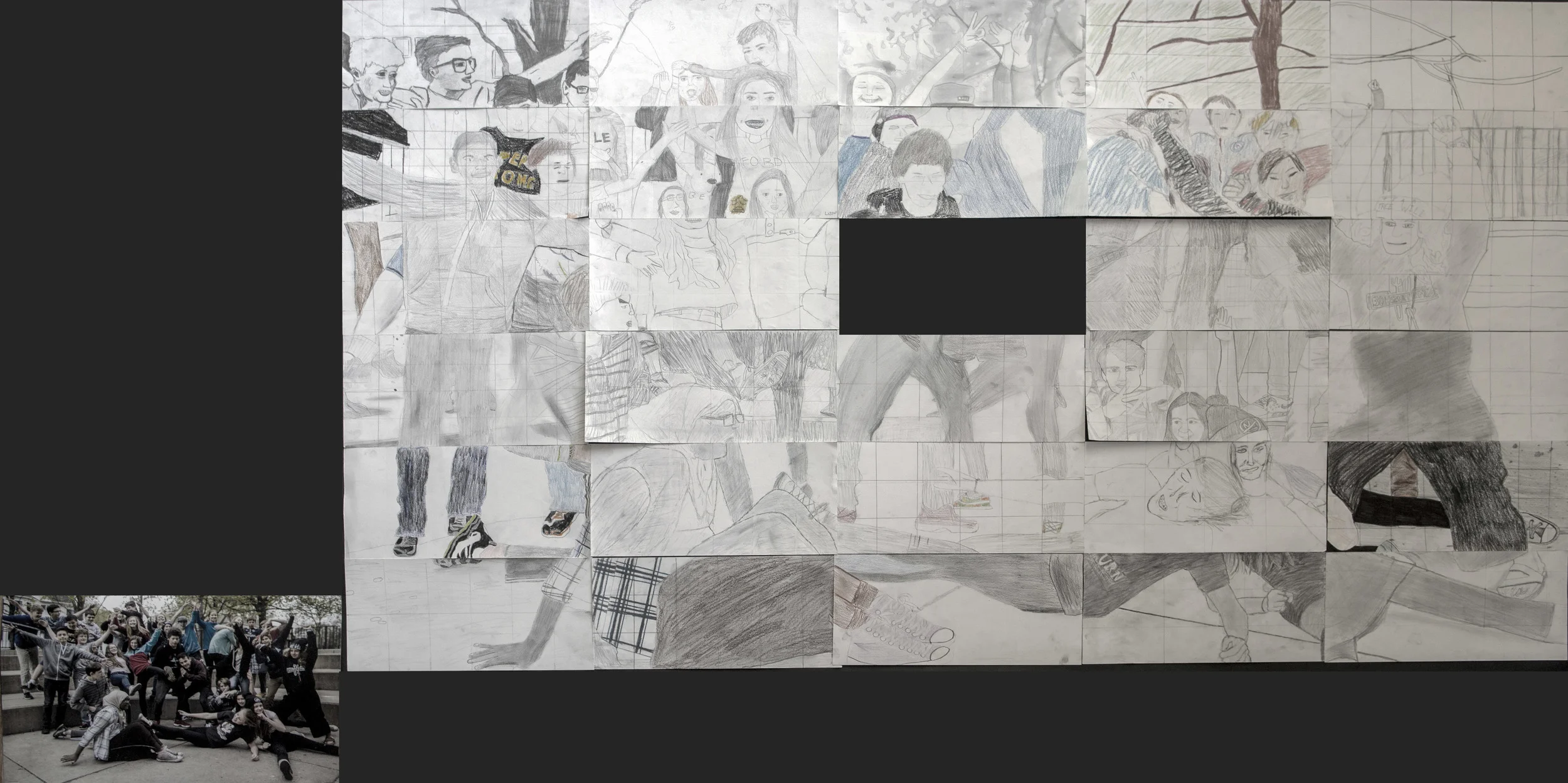 An arts project involving drawing and math. The students will create an enlargement of a section of a photo of their class. They will use the smaller piece of the photo that has been pre cut and enlarge it on a blank white sheet using a grid system. A brief overview of ways math is used in the practical world everyday like animation will be shared for example. After students finish drawing their portion of the photo it will assembled by the students working as a team to find where their squares goes.